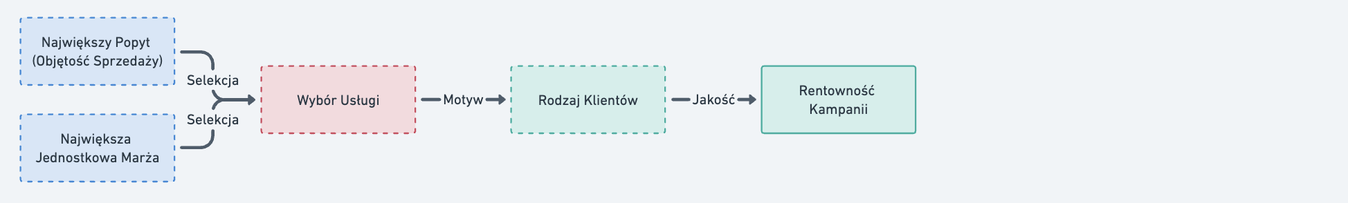 Podstawą każdej rentownej kampanii marketingowej jest przede wszystkim wybranie rentownego typu usługi, ponieważ typ usługi, który będziemy promować zdecyduje o rodzaju osób, które finalnie przyjdą na konsultacje co z kolei będzie kluczową zmienną mającą wpływ na sprzedaż i jej marże, a co za tym idzie na nasz cel końcowy, czyli zwrot z inwestycji.